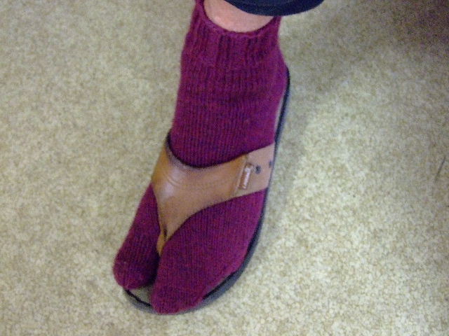 First off, I couldn’t use my customary ” left/right toe cap” in the “More Toes” tutorial (click my “Tips and Tutorials” page) because of the large amount of increases I would need to accomodate the ankle measurement, so to solve that problem I opted for my “Slipper Toe Cap” pattern instead, using the width of the three middle toes for my provisional cast on ( see “Tips and Tutorials page). When my toe cap was completed I began increasing equally on each side till the entire toe area was complete.