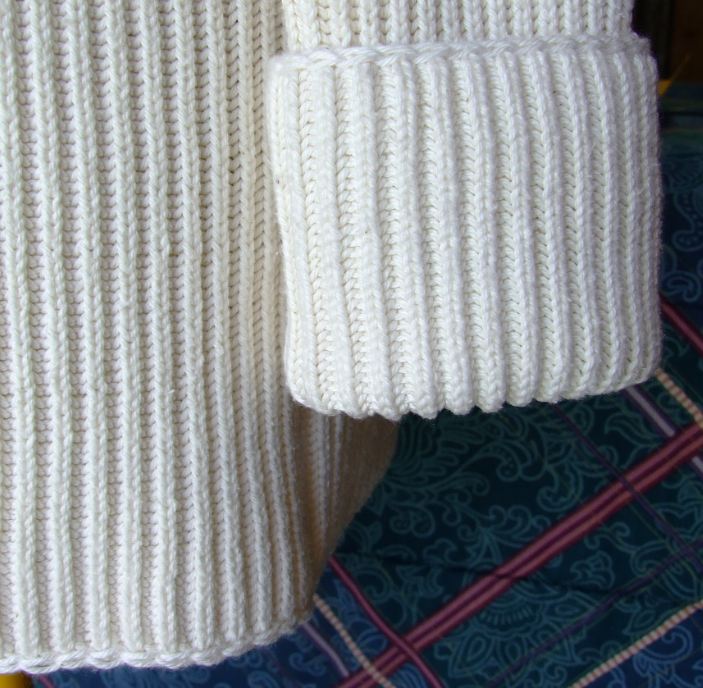 Here is a photo of the finished product. You can see it makes a beautiful decorative edge for both bottom and cuff.