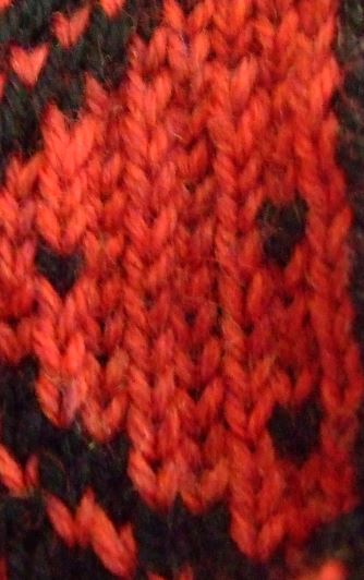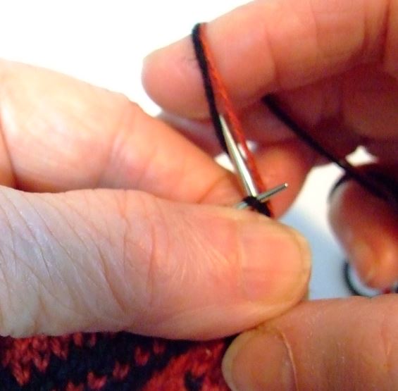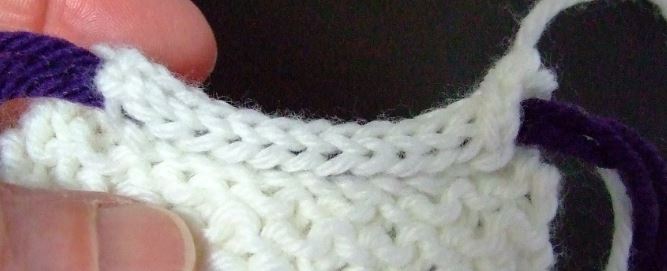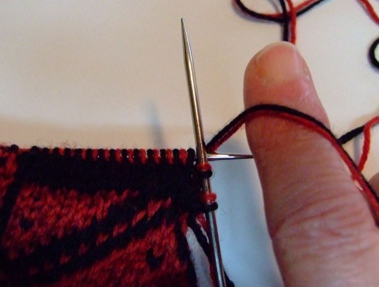 Because I had striped the ribbing, I was able to use a crochet hook to slip stitch the opposing purl bumps that formed the black strips together (top of photo) to form a casing for the joined elastic band. The next step was to slip another elastic ring over the sock in into the area just under the first casing. Using the crochet hook again, I slip stitched the top edge of the stocking to the base of the ribbing.