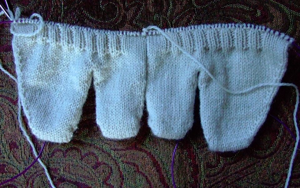 As for knitting, I am at present working on tabi boot socks for my brother. I have both socks on two needles.