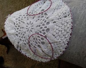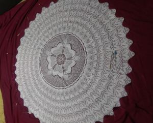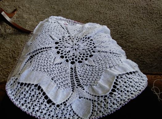 Since I didn’t want this tablecloth 72 ins, I decided to work it until I thought I had about 60 inches. However, the only true way to know when I reached that point, or near it, was to block it.