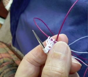 I learned how to do this when working on the Princess Shawl designed for the Queen of England. The lady who published the pattern advised checking out what the final blocked edging looked like. Her advice was, “When in doubt, block it out.” The only stipulation is to have all your stitches on needle cords, and secured with stoppers.