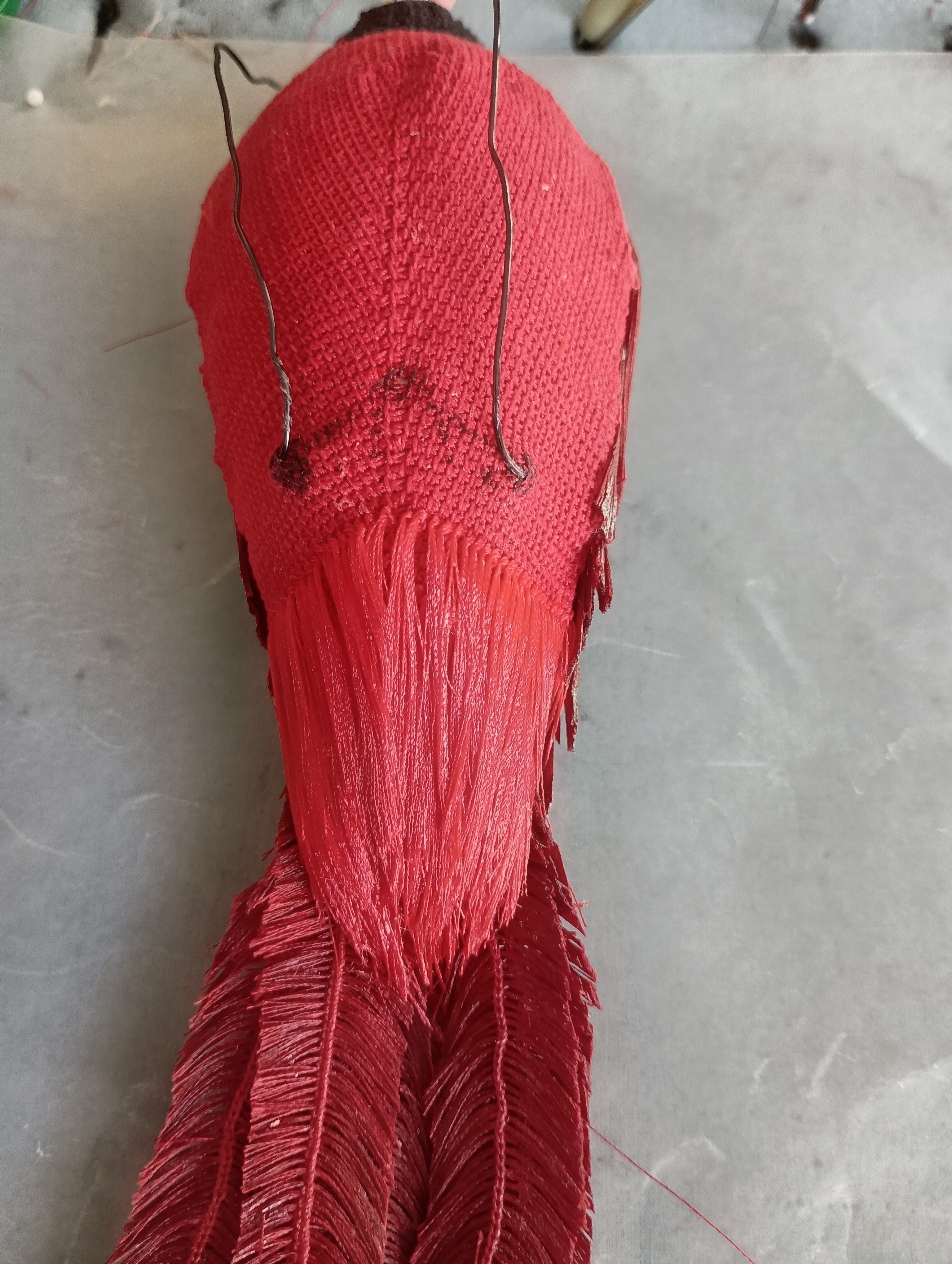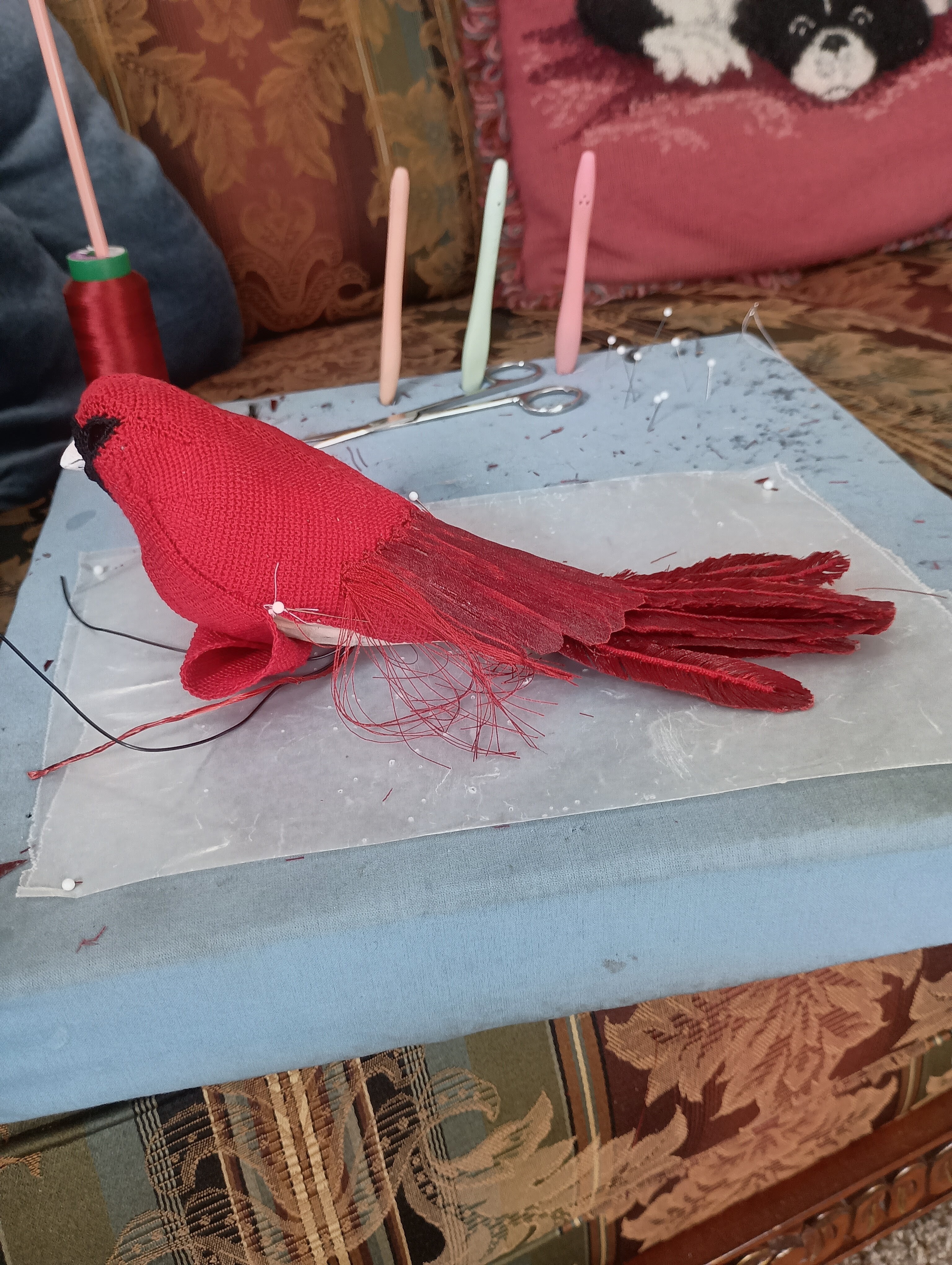 I thought I would share some recent photos of my progress. I am so thankful that I decided to use my “basketweave, or Burlap” stitch for the base. As you can see in the photo, it allowed me to use the flat posts to insert the silk threads for creating the “contour” feathers of the Cardinal.