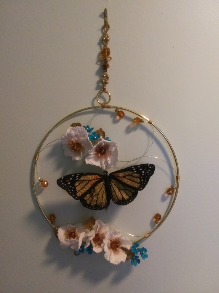 Just to get to what you see, has taken me weeks. Each bloom has 6 petals, two smaller ones, two more rounded ones for the top and bottom, and two more pointed ones at the sides. The construction of the stamens was a combination of fine wire, and a glue gun. Then fingernail polish is used to color the tips as desired.