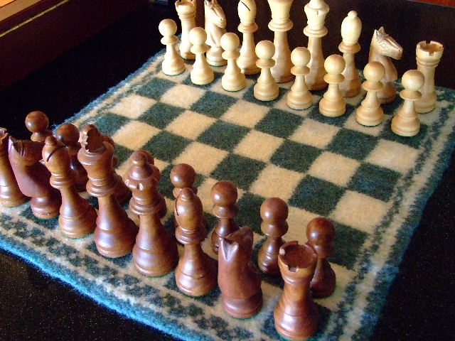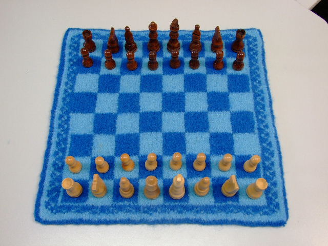 There are two version of the Chess Board in this pattern, the large one measures about 19 inches square when felted, and the playing field block are approzimately 2 1/4 inches square. The smaller version (blue) measures 12 1/4 inches square, with its playing blocks measuring about 1 1/4 inch square.