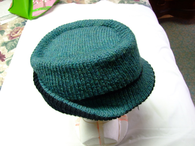 This hat was great fun to make. The rib construction is shaped with three different size needles and the crown is designed with short row shaping. This hat also uses two weights of yarn- 3 ply wool, and fingering yarn. The lighter weight is used to knit the inside lining of the cap. It is very stylish and comfortable to wear. As in the pattern for the Mock Tyrolean hat, this one also has a visor insert.