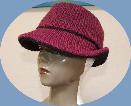 The Mock Tyrolean Hat pattern offers serveral versions, tapered crown and flat crown ( above). The basic pattern is constructed with a 1 by 1 rib that is not stretched. This makes it a very warm winter hat. The brim can also be lowered in the back for those chilly winds.