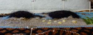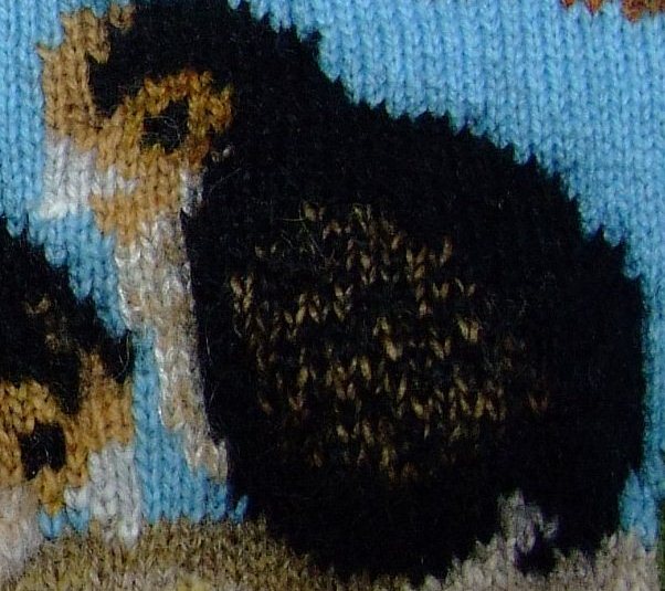 The chicks were especially fun to do with a combination of Aloft mohair, added to a ply of fingering yarn. Their 3D look was accomplished by adding an additional two strands of the black mohair to the belly and wing area. Adding these extra strands automatically increased the gauge without changing the stitch count. I was able to restore the gauge around the area by filling the void with poly fill stuffing, then running a few strands of lace weight across the back, side to side, and top to bottom. Taking up the slack with these strands, allowed me to contract the surrounding stitches back to their proper gauge. The next move after blocking the top was covering the back with nylon net, (great stuff, by the way) and stitching around the expanded portion of the chicks,so that it would remain securely in place.