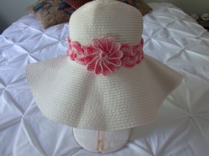 Below is a photo of my store bought hat with a crocheted tape lace in variegated pink.