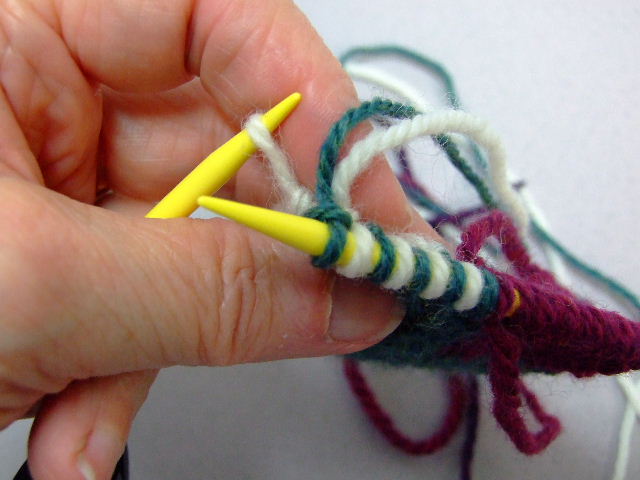 Pick up purl yarn (CC)and bring it to the left, under the tip of the needle and to the front.