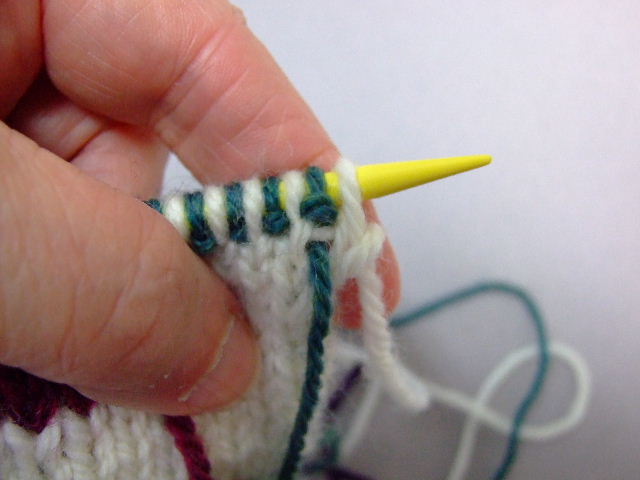 The problem was solved when I began to think, INTARSIA! I realized that I could combine any amount of colors if I began to handle them as an Intarsia pattern. The only difference is that I will be working both sides of the picture at the same time. So… here’s the fix!