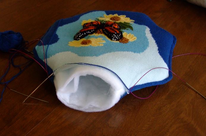 Having done that, I folded the quilt batting into itself and hand stitched the edge together. Next step- close the top.