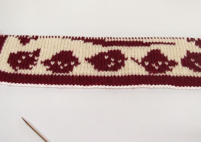 I knitted 17 rounds of rib to my desired height. My life lines were put in on round 7, and 12. Rounds 18-19 were worked even. At round 20, I made my YO opening in the center back 3 stitches. Worked 3 more round even, then stopped and pickup the stitches off my nearest lifeline. Next I worked 2 more rounds. Next round ,worked buttonhole(YO), then worked next 2 rounds even. Picked up stitches off last lifeline, and cast off. I inserted elastic, overlapped it one inch, and stitched it by hand. My brother had previously sent me the measurement for the elastic, so I knew I was in the ballpark.