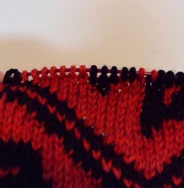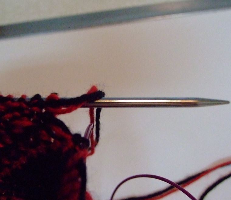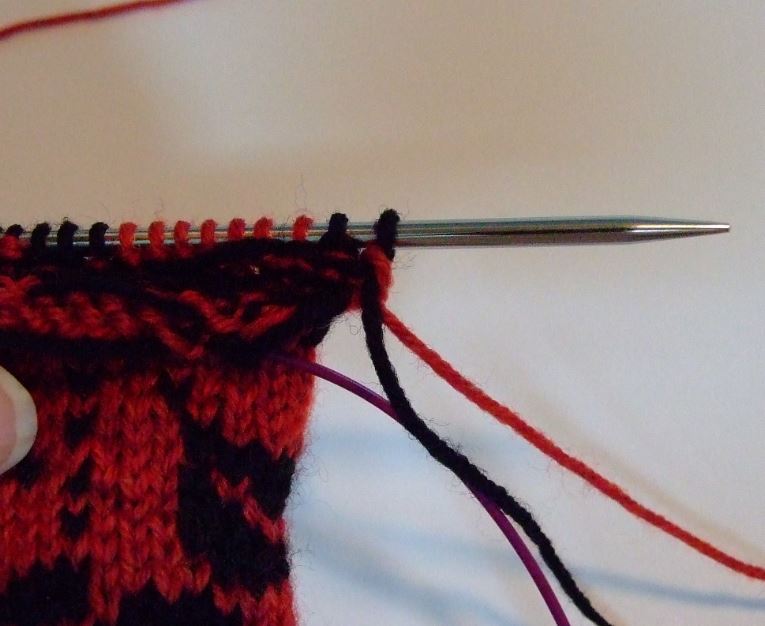 The upper section of the above photo was done in the second method, repositioning the needles as I worked around the chart.  Of course, another benefit of this method is that you yarns don’t get tangled as they remained in the same place all the time(black on the right, red on the left).