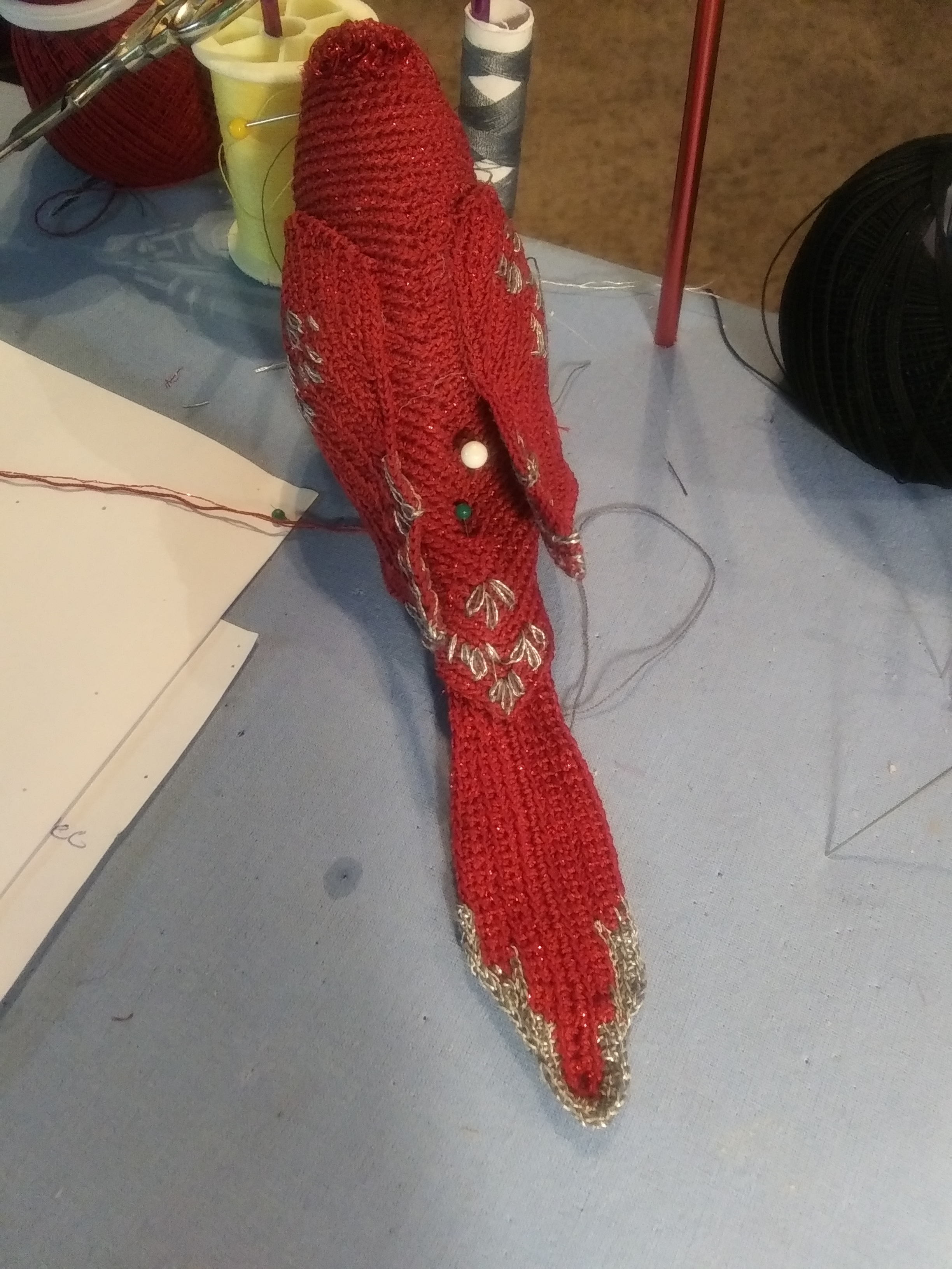 I used size 20 crochet thread, and 1.25 hook for the main body, wings and tail, with the addition of a single red iridescent embroidery thread. The additional thread gives it a little shine, and is picked up by the Christmas lights on the tree. I also use it( the spool on the extreme left of the photo) to add a bit of sparkling color to the crown of the head.