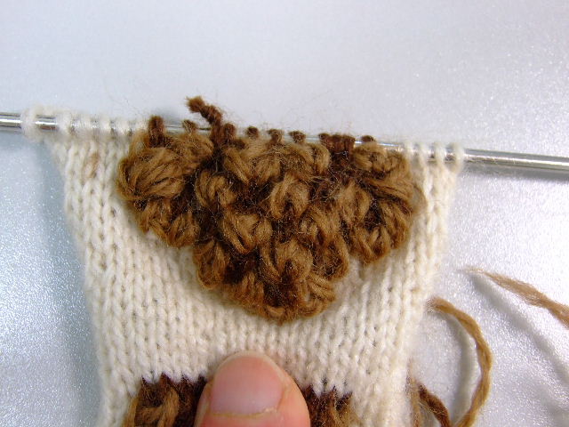 In this photo, you can see that I inserted my needle from back to front. I will proceed by placing my thumb and index finger below the stitch group and then gently raise the yarn up with my right hand index finger.